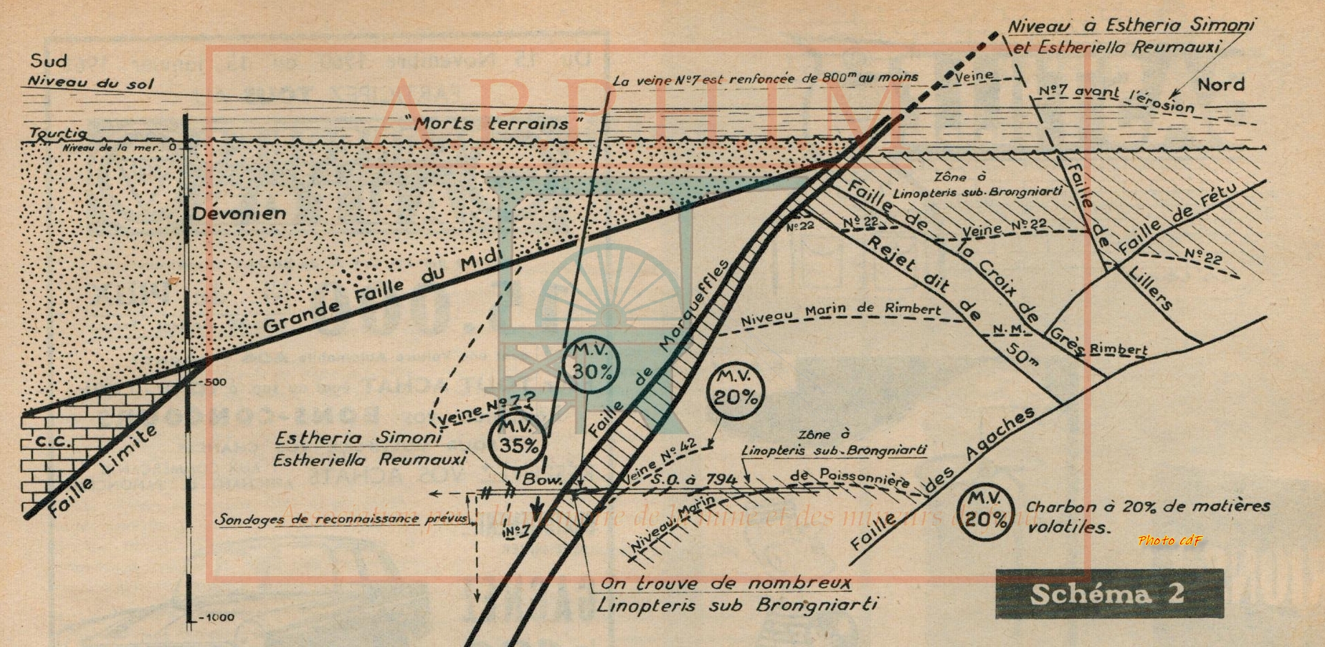 La bowette Sud-Ouest du siège 5, bowette horizontale à l’étage 794, vient de traverser la Faille de Marqueffles qui renfonce le gisement, selon notre hypothèse de plus de 800 mètres. Dans cette bowette, immédiatement avant la rencontre de la faille, nous sommes aux environs de la 42ème Veine dont le charbon a une teneur en matières volatiles de 20 % ; après une trentaine de mètres de creusement en terrain failleux, nous recoupons quelques petites veines en place dont la teneur en matières volatiles atteint 30 % ; un des toits renferme, parmi d'autres fougères, le Linopteris sub Brongniarti. La confrontation de ces renseignements avec ceux que donne l’échelle stratigraphique normale montre que le rejet de la faille traversée est très important.